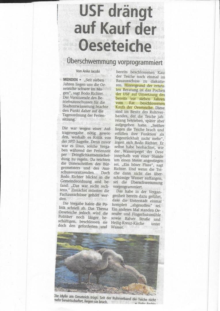 Wir haben nie behauptet, den Beschluss allein gefasst zu haben, sehen uns aber berechtigt, darauf hinzuweisen, dass die USF seit dem Beschluss des Rates auf Erwerb der Teiche vom 11.03.2008 diesen Erwerb permanent auf die Tagesordnungen gebracht hat, so auch im Arbeitskreis Hochwasser.