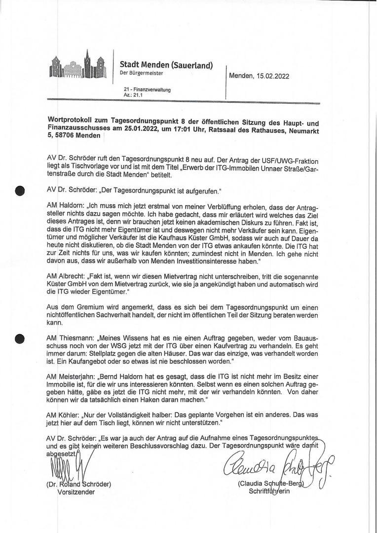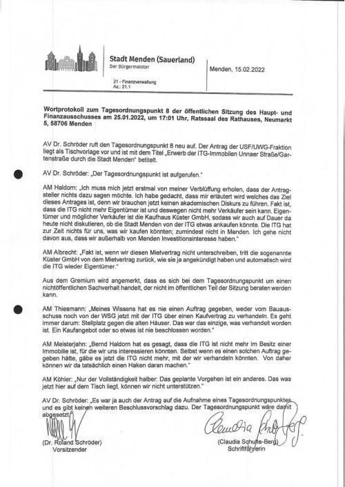 8. Erwerb der ITG-Immobilen Unnaer Straße/Gartenstraße durch die Stadt Menden- Antrag der USF-UWG Fraktion v. 19.01.2022, eingegangen am 20.01.2022