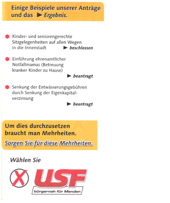 Da fragt er, rein rhetorisch natürlich: "Könnten Sie auf Anhieb drei konkrete Themen nennen, derentwegen Sie am Sonntag die Partei X in den Mendener Stadtrat wählen wollten? Eben." Will sagen, nichts Genaues weiß man nicht.